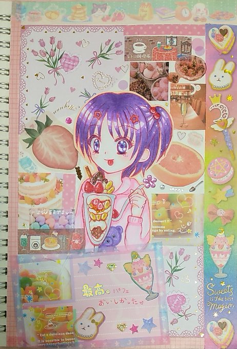 コラージュ2作目、完成(^^) テーマは、Sweets(っ´ω`c) 前回と似たようなテイストだし、ちょっと…ごちゃごちゃしすぎたかな…(´・ω・`) 3枚目加工有。 #コラージュ #イラスト #コラージュ好きさんと繋がりたい #イラスト好きな人とつながりたい