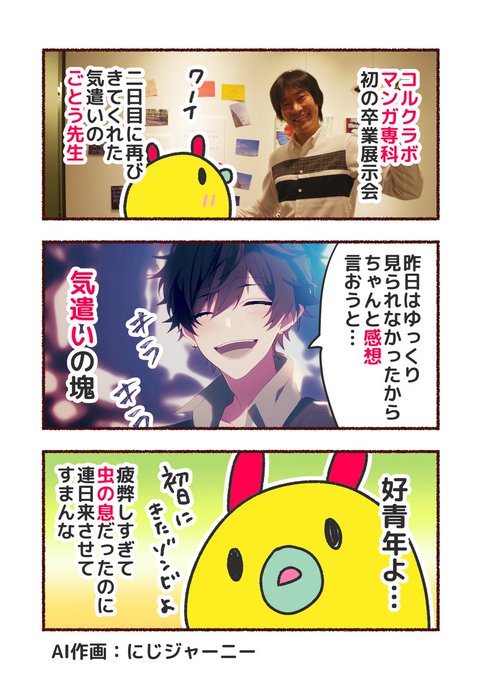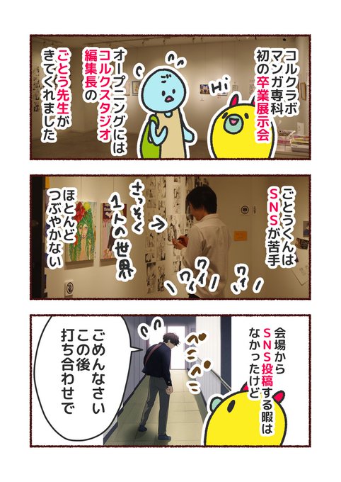 #コルクラボマンガ専科卒展 オープニングの感想です。卒展初日、大事なオープニングにいらっしゃったごとう先生のツイートは、AIに夢中でした。 おい、ごとう。 #コルクラボマンガ専科 (1/2)