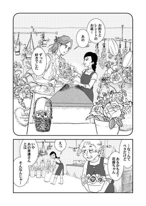 お花屋さんにて。 お客さん「店員さんならどんな花束を 貰ったら嬉しいですか?」 店員さん(これは…😳もしかして…!?////) (1/2) #漫画が読めるハッシュタグ #コルクラボマンガ専科 ※再掲です