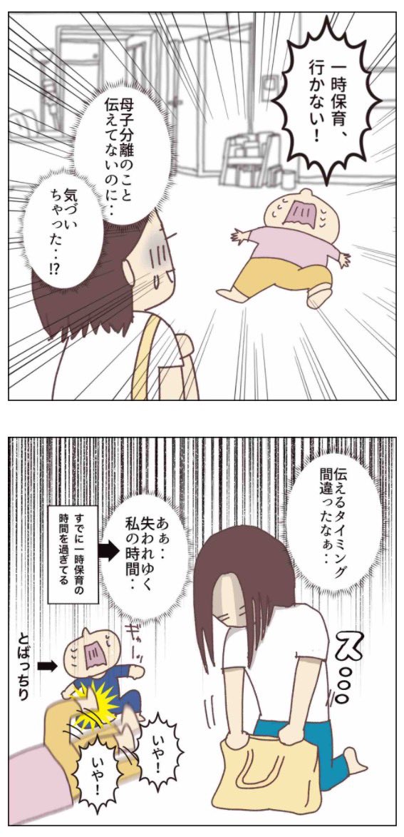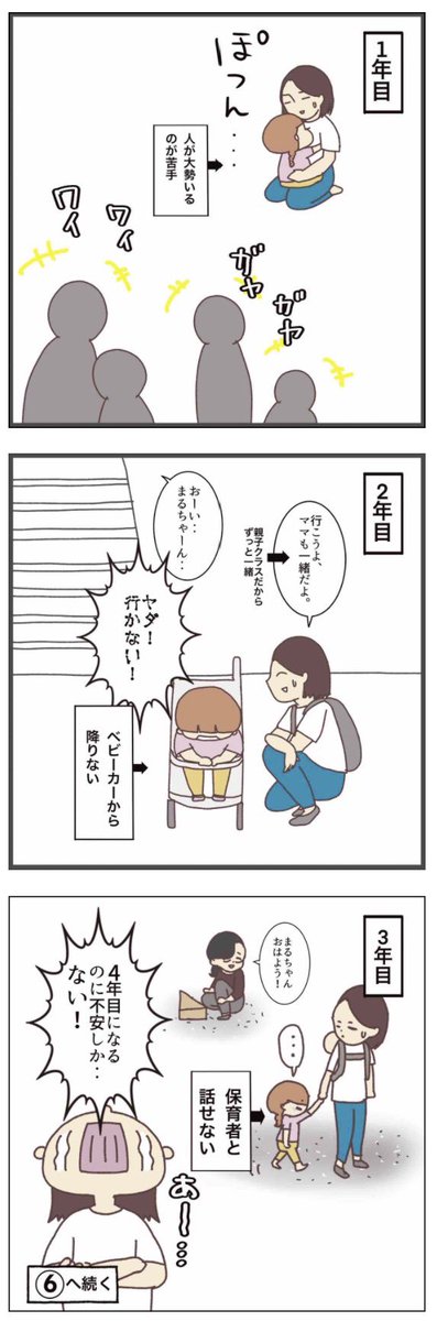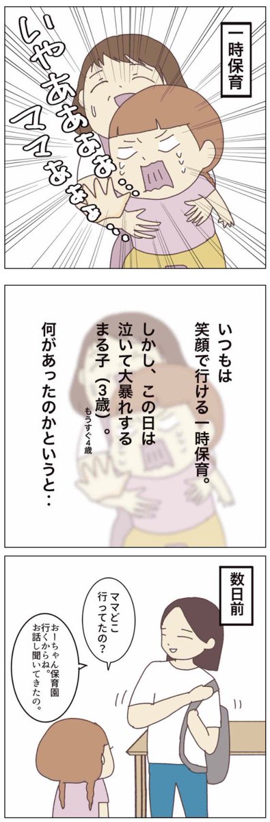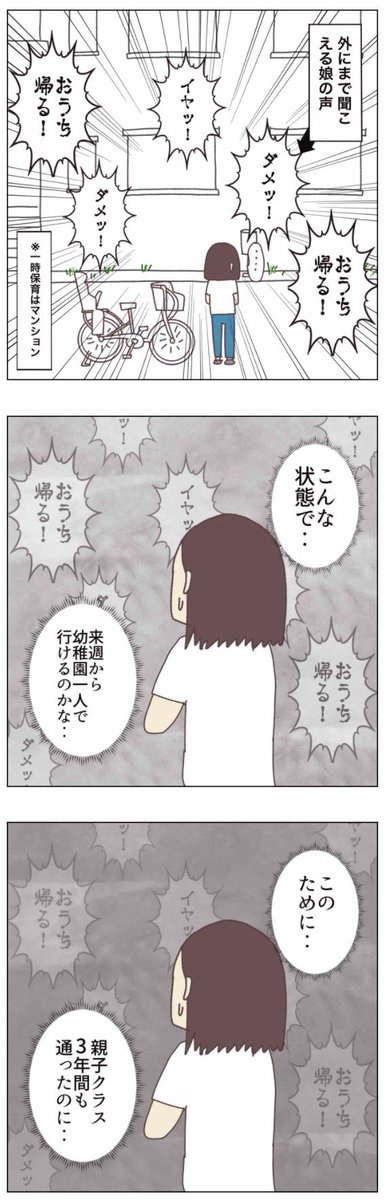 ◼️幼稚園一人で行けるのか…【5話】 一時保育ですらこんな状態。 再来週から始まる幼稚園に、 本当に一人で行けるのか? 不安ばかりがつのる…😨 #コルラボマンガ専科 #子育てあるある #育児漫画