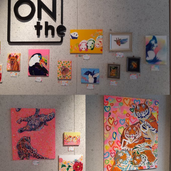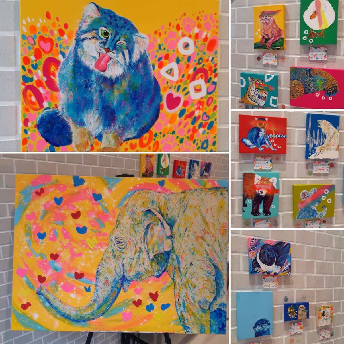 #ギャラリー巡り 10/11 その2 大阪梅田 #コワーキングスペース #ONtheUMEDA で開催中の MOCCHIさん @mocchicolor の #個展 #愛と動物と色 に行ってきました~🥰 MOCCHIさんの愛に溢れたカラフルな動物たち🐘🐯に癒された~😍 🐘の絵は皆で❤💛💙💗を描いて仕上げるそう✨ あたしも♥️描かせてもらった👍