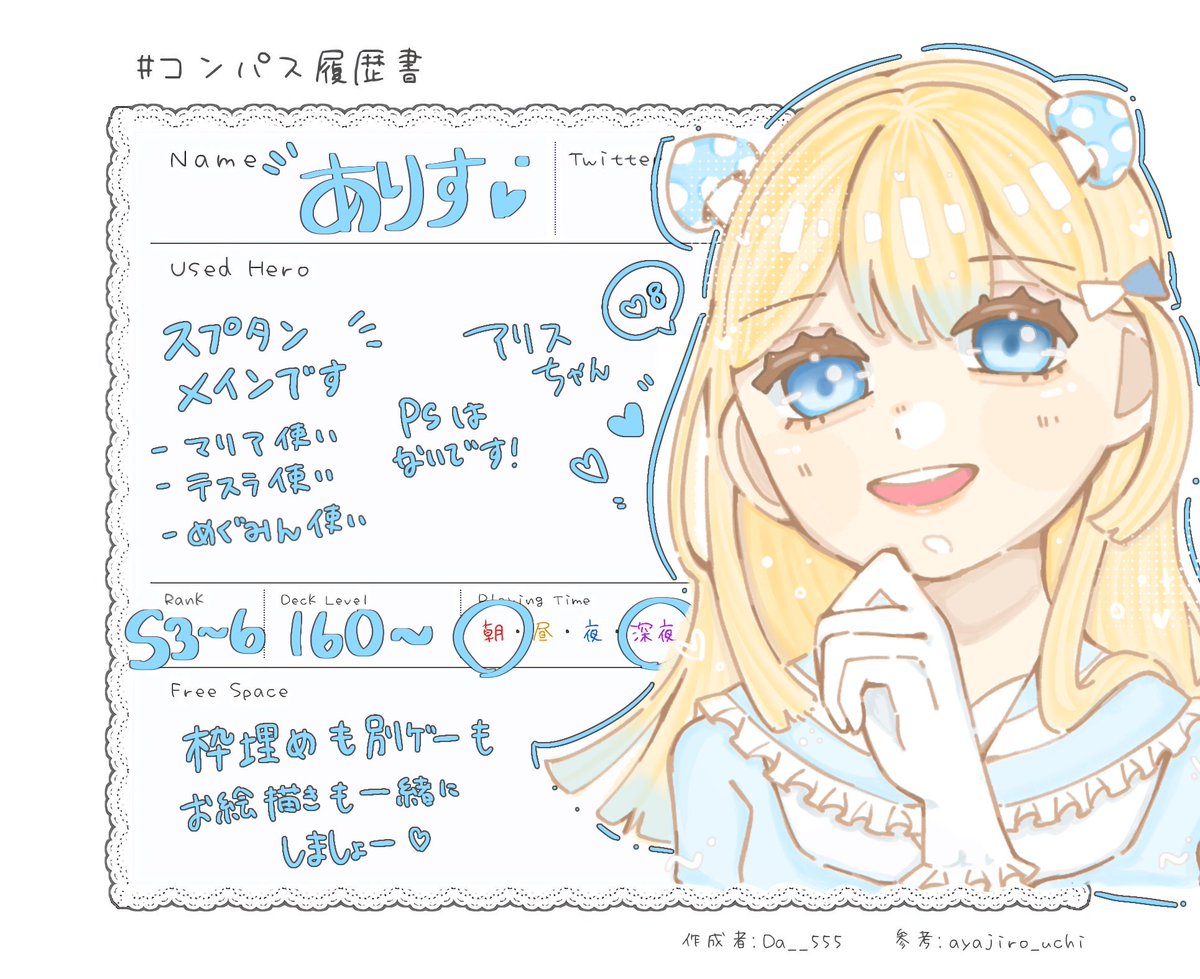 アリス使い取れたので更新!! ♡と♲でお迎えします! 名前アリス実装前からありすです アリス最推しです🫶🏻🫶🏻🫶🏻 他ゲーもお絵描きもしてるのでいつでも誘ってください🥰 #コンパス履歴書 #コンパスお絵描き #コンパス民と繋がりたい