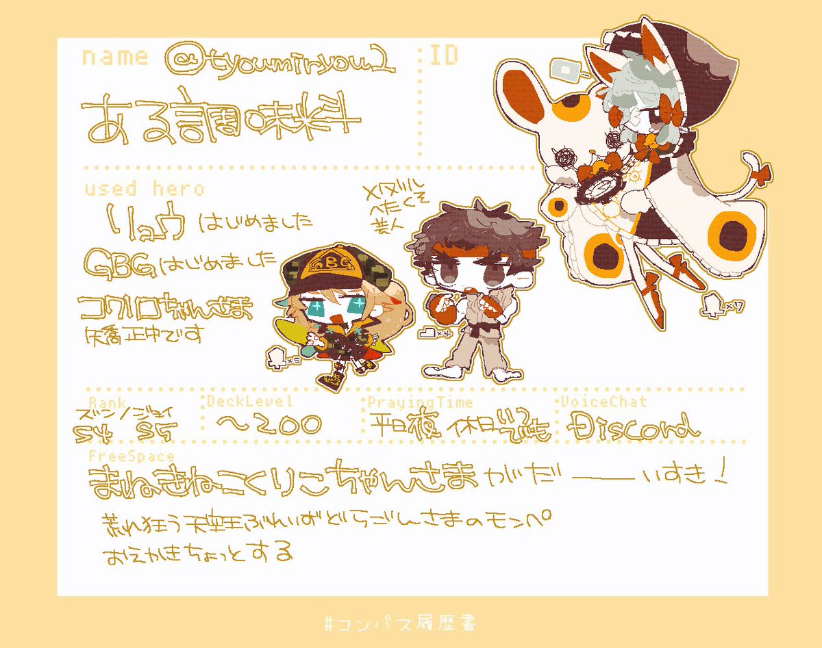 久しぶりの履歴書更新!!! 履歴書とタグお借りしました🙏 ⚠️喧しい雑多垢⚠️ ♻️or♡で気になった方お迎えします #コンパス履歴書 #コンパスお絵描き勢と繋がりたい #コンパス絵描きさんと繋がりたい