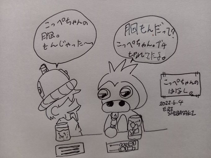 「こっぺちゃんのはなし。」 最近。おさるさんの後輩になったこっぺちゃんがお気に入りのコンパマン。 こっぺちゃんの胸をもんだ事を自慢したコンパマン。おさるさんもキレながら、こっぺちゃん。ぶちギレだった事を話す。 #おさるさん #コンパマン #絵描きさんと繋がりたい #絵師さんと繋がりたい