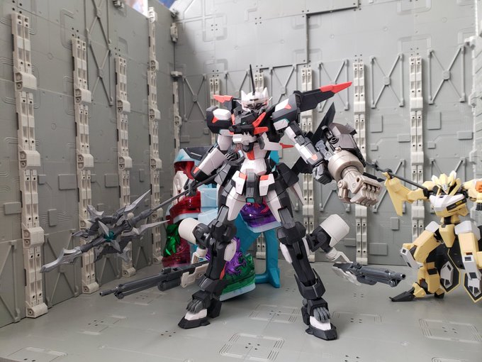 ハンドレッドエッジ・スプリガン③ 最初から、このポーズ取らせたくてケツそこに3π穴仕込んでやりましたよ。 抜刀姿勢で敵に突っ込む様が再現できました。満足感がましました! #今月作ったプラモ晒そうぜ #ハンドレッド・エッジ #コードビースト #倉持キョーリュー