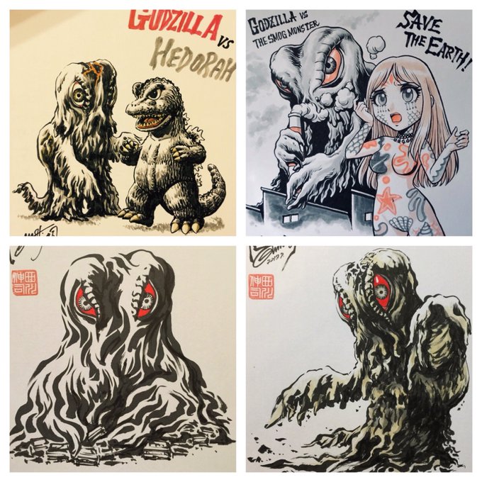 #みんなで楽しむTwitter展覧会 #illusRT #ArtistOnTwitte $picrt #smogmonster #hedora #ヘドラ #ゴジラ対ヘドラ 工場排水により腐臭漂う河川、煤煙により曇った空。半世紀前に撮影された風景は単なる空想ではありません。 「環境、環境」と叫ぶ企業の薄っぺらさは、本作を見ればよくわかります。