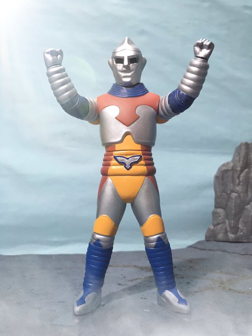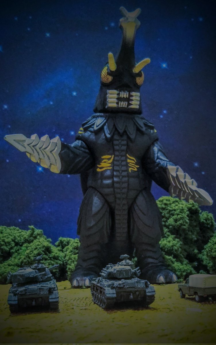 #夜のフィギュア撮影会 お題「自動」(過去) 本来操縦機で動かす方式のロボットだったが、正義の意思が芽生えた結果、巨大化して自動的にメガロと戦う様になった、ジェットジャガー。 #ゴジラ対メガロ