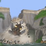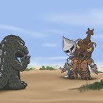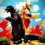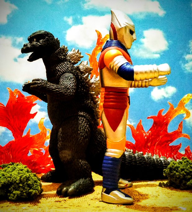 #夜のフィギュア撮影会 お題「祭」(既出) 「東宝チャンピオンまつり」の上映作品 「#ゴジラ対メガロ」より、 メガロの地熱ナパーム弾の攻撃で周囲が火の海になり、絶体絶命のピンチに陥った、ゴジラとジェットジャガー。