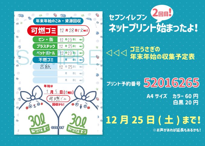 リクエストがあったのでネットプリント再登録したよー! プリント予約番号が前回と異なるのでご注意ください! 今回は12月25日まで🐰✨ 引用先の画像の保存・使用は変わらずフリーなのでこちらもぜひご活用ください✨ #ゴミ出し #最後のゴミ出し #大掃除 #冬の創作クラスタフォロー祭り twitter.com/gomi_usagi_30/…