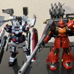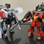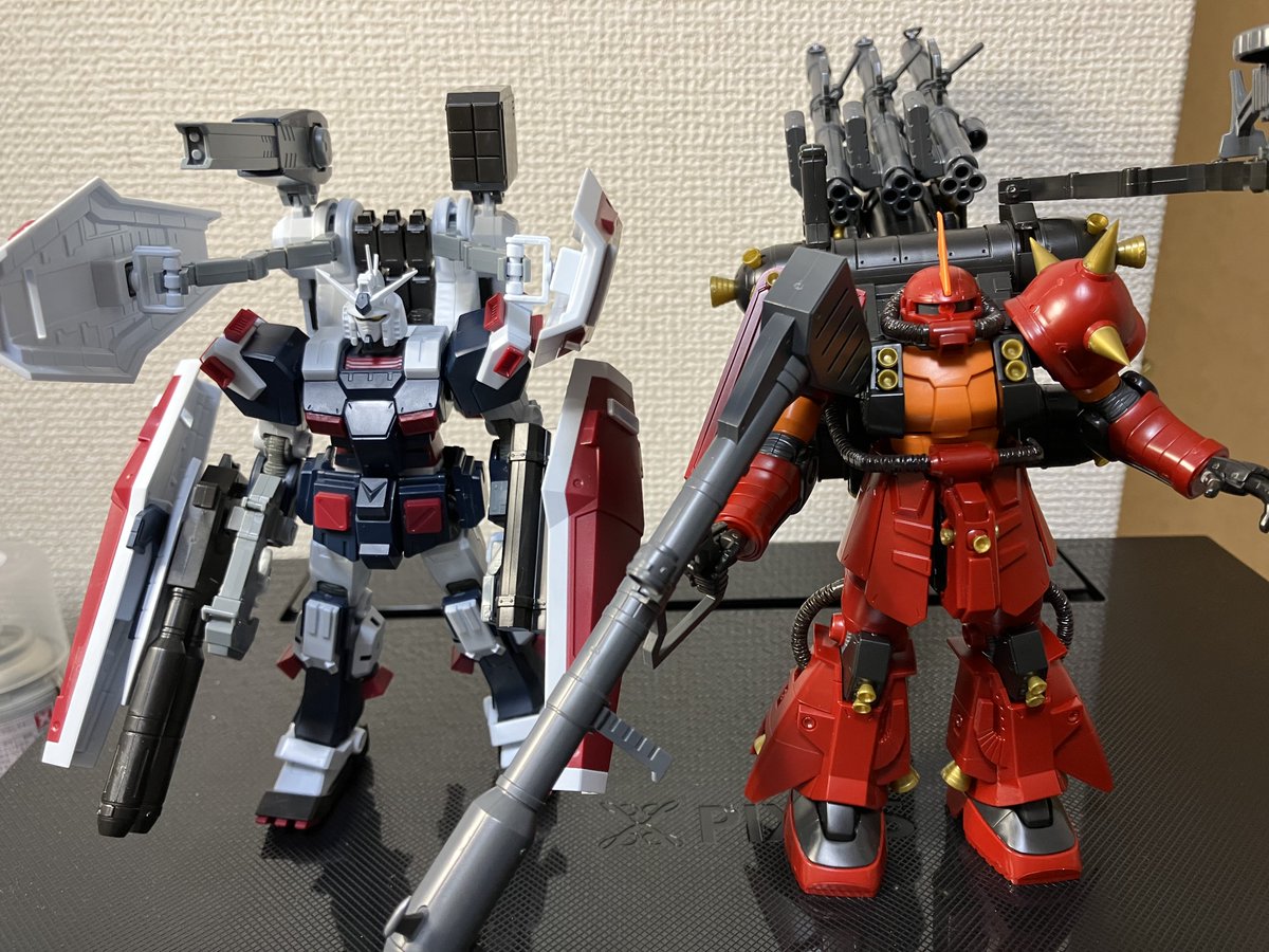 日曜日最終回迎える #サンダーボルト のHG主役機2体です。素組のみですが間に合ったよ。 前ツイートで台座の件は、なくてもブースターの 支えがあるから立つよ。 #サイコ・ザク のモノアイはぴかーんと #フルアーマーガンダム と並べるとスゲー #ガンプラ #ガンプラの画像貼るとRTされると聞いて