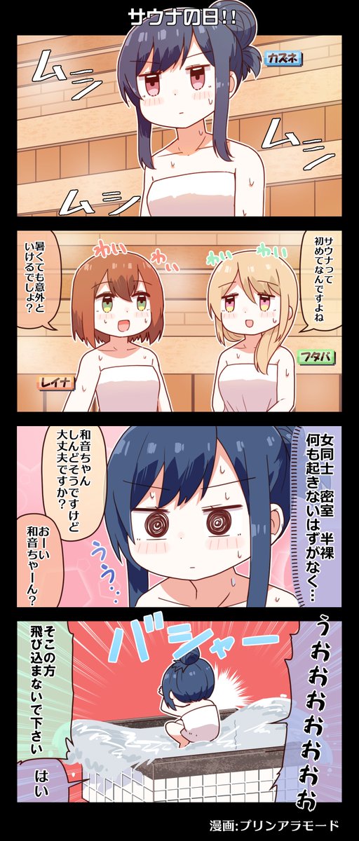 #電音部 4コマ漫画📚 #サウナの日 !!━━━ 漫画:プリンアラモード(@Purin_a_La_Mode) ▼3/25 #電音部バトルロイヤル 本日23:59まで‼ 現地チケット🎫 denonbu.jp/event/battle/ ▼4/9(日) #電音部アザブ単独LIVE プレオーダー先行抽選申込 受付中🙌 denonbu.jp/event/mystar #ゆるおんぶ