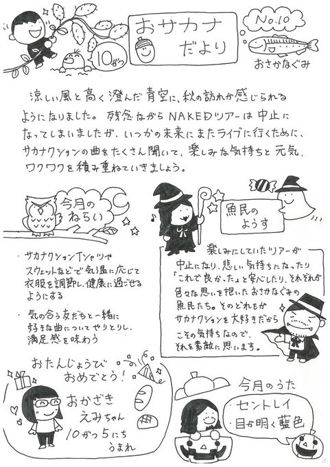 #サカナクション #サカナファンアート #おサカナだより 遅筆!(笑)😂💦 遅くなりましたが、10月のおたよりです! 食欲の秋・芸術の秋・読書の秋・スポーツの秋… サカナクションの秋!ᐠ( ᐛ )ᐟ✨ 寒暖差があり体調を崩しやすい時季なので、皆さんご自愛ください✨ うがい手洗いサカナクション!🐟✨