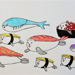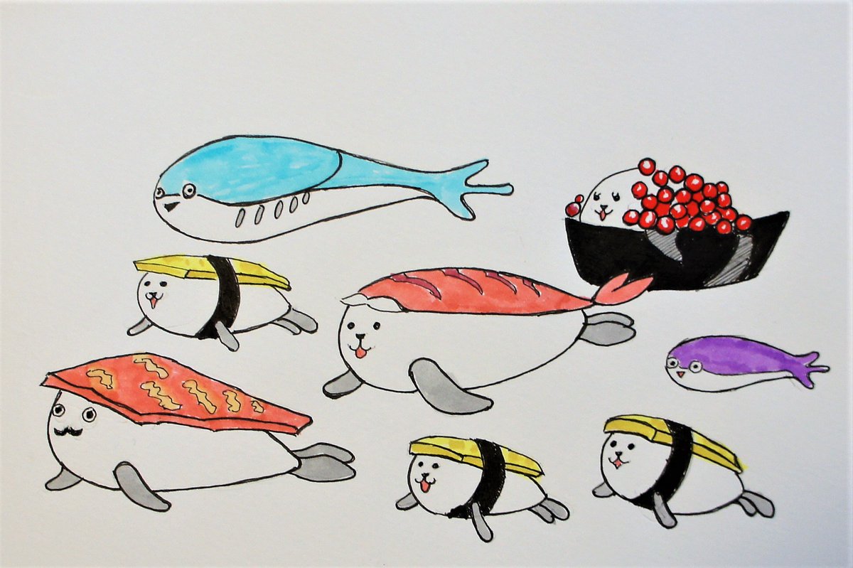 #サカバンバスピスの冒険 夕食の支度が済んでざっくり描いてみましたが、サカバンバスピスって、昔流行ったすしあざらしと一緒にいてもそんなに違和感ないですよね? そういえば最近お寿司食べてないですわ💦🍣