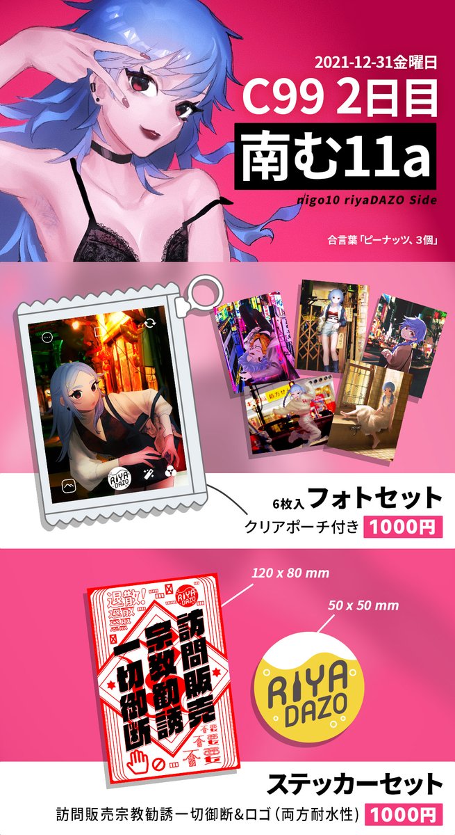 🚨リヤダゾ的初売りのお知らせ🚨 #C99 で頒布したフォトセットの強化版、 「riyaDAZOはぴはぴセット」を1/6から販売🔥 ポーチにステッカーに盛々増量~! 正月だし福袋的に販売するぜ🎍対ヨロ~ ⏲️2022/01/06(木) 20時頃発売 🛒riyadazo.booth.pm/items/3557203 #サキュバスのリヤ