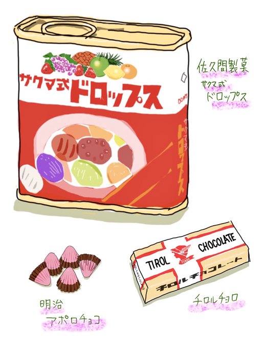 つづき… なつかしいお菓子たち😊 サクマ式ドロップスは、 出た色のアメを必ず食べるのが我が家のルール 交換不可! 白が出ないこと願っていたなあ☺️ 前回のお菓子たち↓ twitter.com/haruno_machi/s… #イラスト #絵 #サクマ式ドロップス #チロルチョコ #アポロチョコ