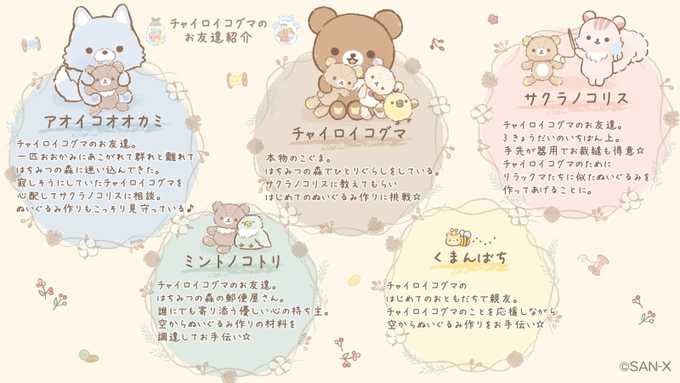 🍯お友達紹介🍯 #サクラノコリス🐿 3きょうだいのいちばん上。手先が器用でお裁縫も得意☆ チャイロイコグマのためにリラックマたちに似たぬいぐるみを作ってあげることに。 #チャイロイコグマのぎゅ〜っとぬいぐるみ