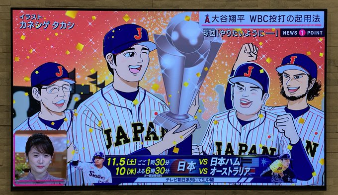 今夜の #サタデーステーション では侍ジャパンWBC世界一の想像図を気合い入れて描きました。大谷さん、ダルさん、村神様……これはもうドリームチームですよ。 そして時代のキーワード #リスキリング についても解説を。要は「大人の学び直し」。ちなみに僕もいま動画編集をリスキリングしてます。
