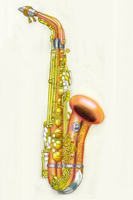 そうじゃった! 今日、11月6日はアドルフ・サックス大先生の誕生日! 偉大なる発明家に敬意を表し、最近描いたオリジナルのサクソフォンをうpしておきますね。 #サックス #アドルフ・サックス #イラスト