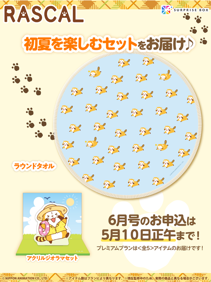 📢2ヶ月に1回、グッズが届く✨「ラスカルサプライズボックス」6月号の申込みを好評受付中だよ。 ラウンドタオル他、オリジナルアイテムが盛りだくさんだミャ!(◆'∇'◆) ▼申し込みはこちらから surprisebox.jp/lineup/rascal #ラスカル #サプライズボックス