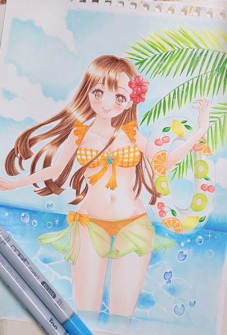 最後の絵終わった〜(っ`ω´c)‼️ もう少しホワイトでキラキラさせたいな॑⸜(* ॑꒳ ॑* )⸝⋆* ペース配分下手くそすぎて 自分殴打したかった🥺 #サマーフェスティバル展 あとは額に入れたり色々やって 発送します! #水着女子 #コピック