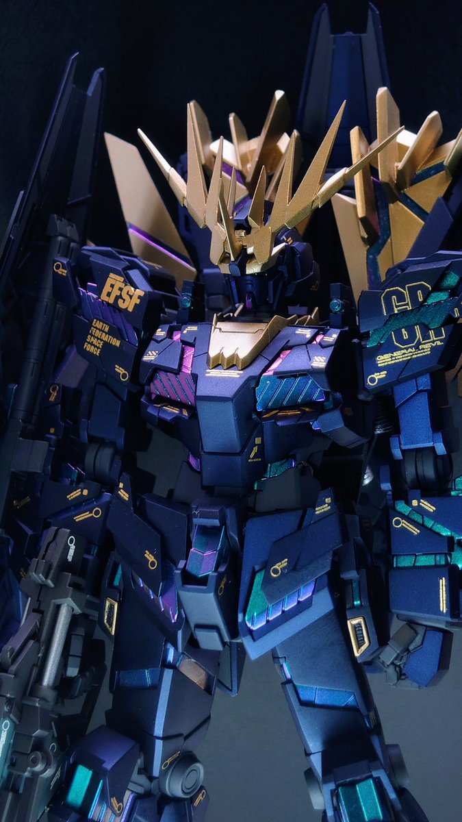 HGUCバンシィ完成!追加装備でトライブースターぽくしてみました。ガイアノーツのプリズムブルーブラックとアレクサンドライトを使った贅沢仕様です。@STYLE_S_Takuyaさんのロボマニと@aspara_mokeiさんのバニーアを使用。 #ガンプラ #サムコンUC完成品