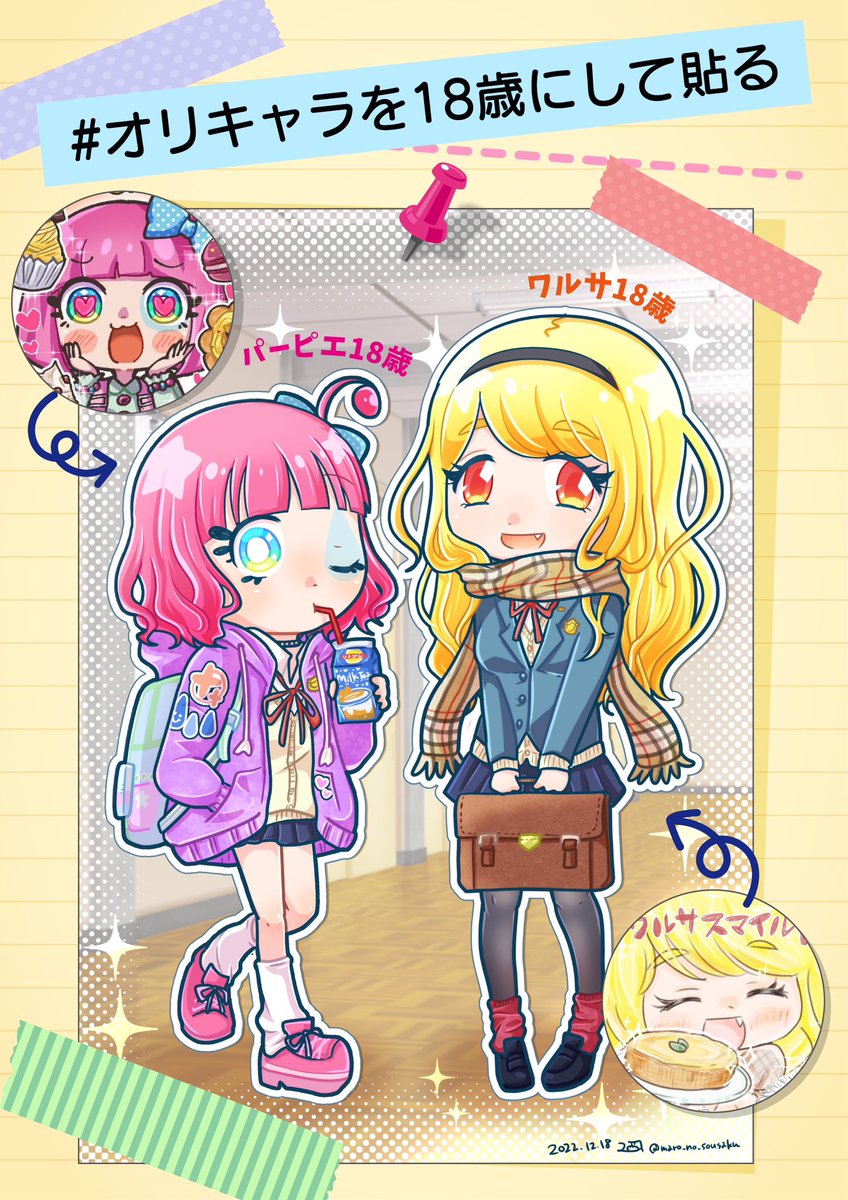 #オリキャラを18歳にして貼る こちらのタグにうちの子のワルサとパーピエで参加させていただきます✨ スクールカースト上位な優等生💛と校内でTikTok撮ってそうなやんちゃ陽キャ💗のイメージ☺️ #サンゲンショク #イラスト