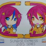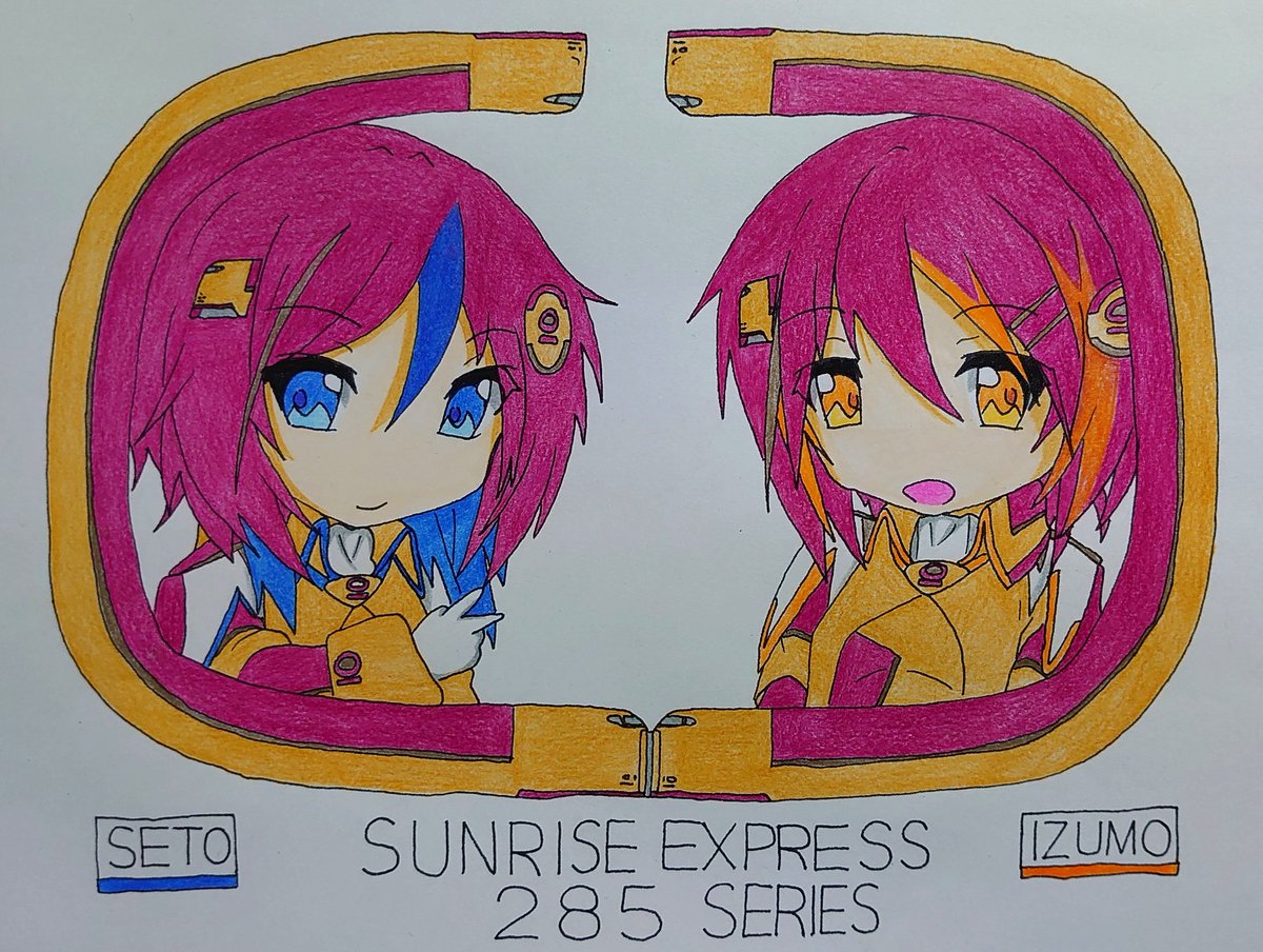 #サンライズ出雲 #サンライズ瀬戸 #285系 #オリジナル #デフォルメ #イラスト #イラスト好きな人と繋がりたい #絵柄が好みって人がいたらいいなぁ サンライズシスターズ 瀬戸舞海(まいみ)/CV:たかはし智秋 出雲巫女都/CV:生天目仁美 JR西日本×東海共同運用の寝台列車!