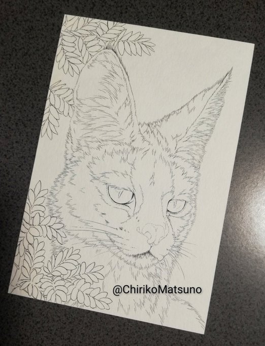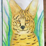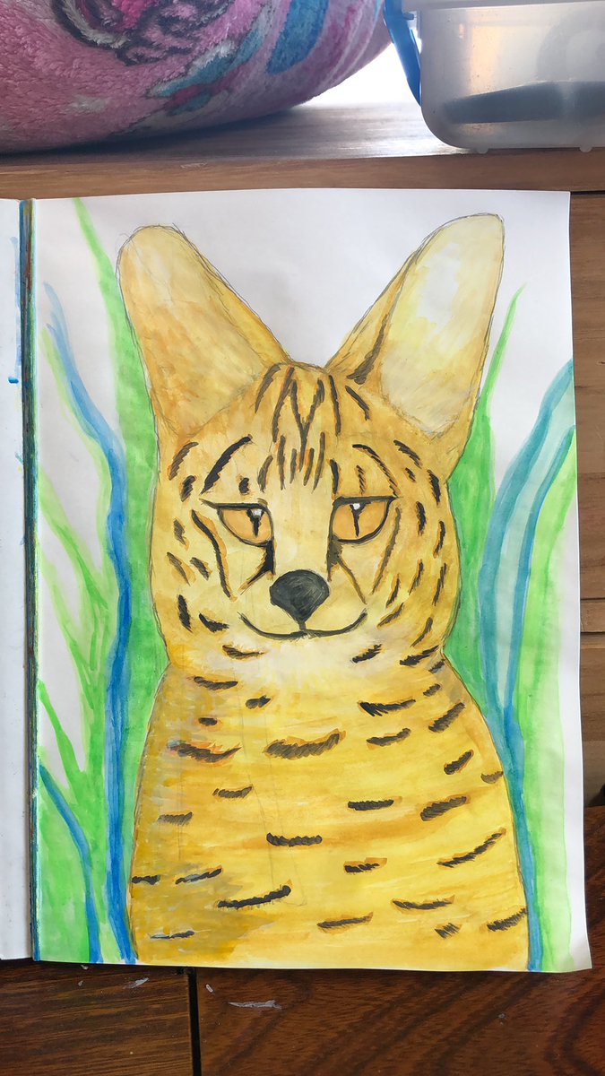 デッサンから散々失敗して更に描き直して何とか描けたサーバルキャットです、耳が大きいのと細くて長くてめっっちゃ長い足が特徴です笑 #イラスト好きと繋がりたい #絵描きさんと繋がりたい #水彩画 #サーバルキャット #動物画