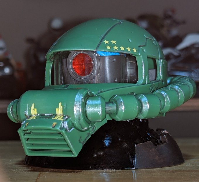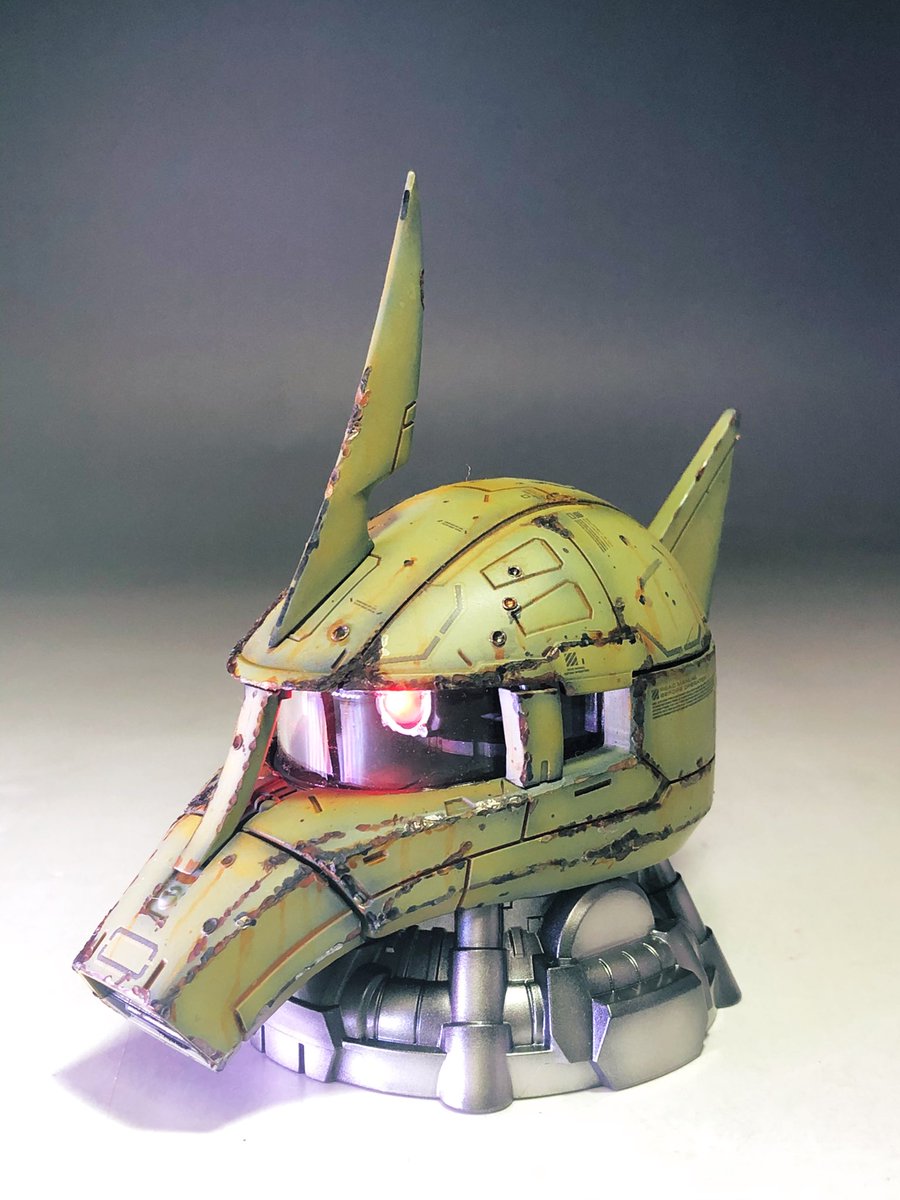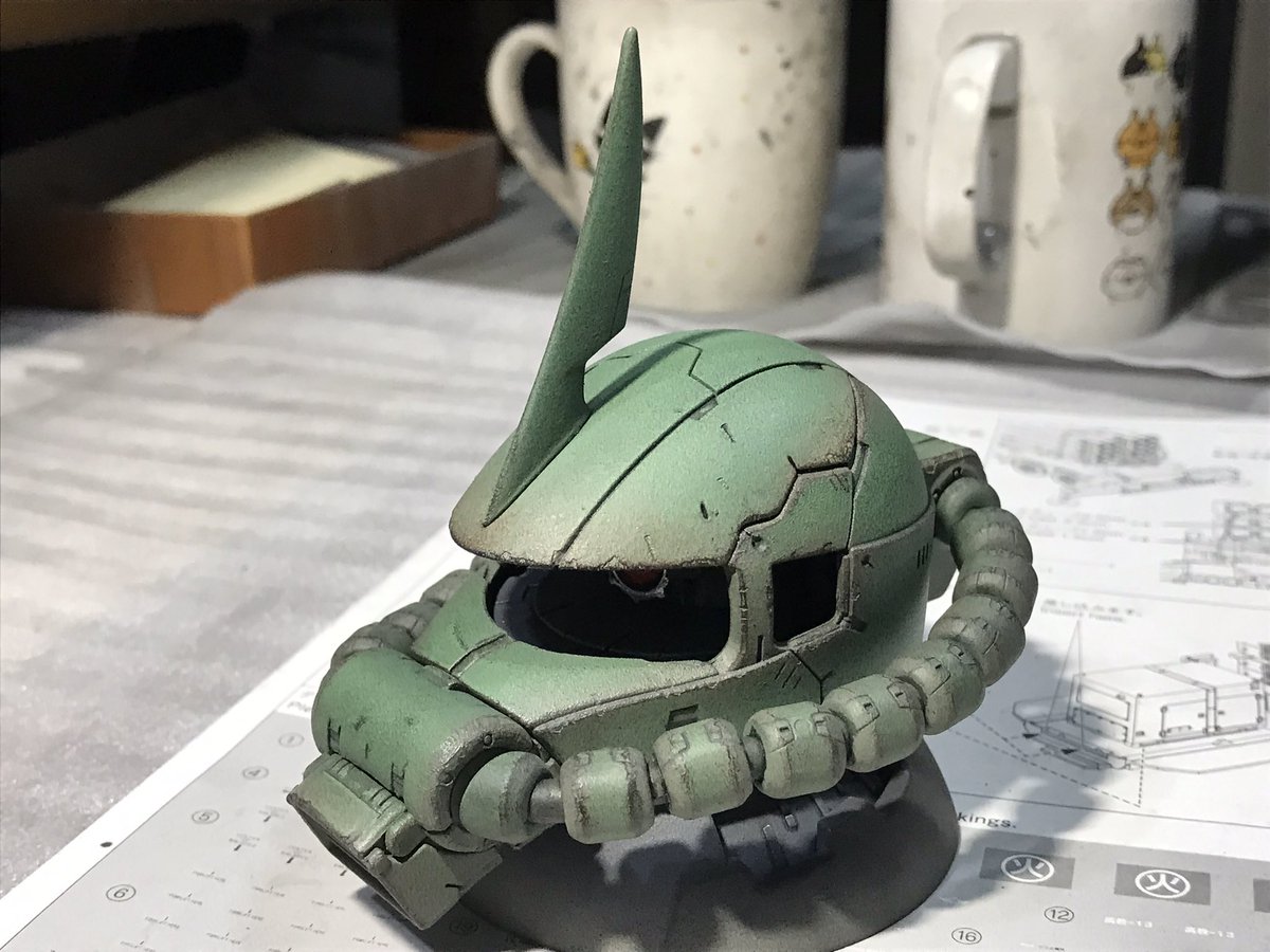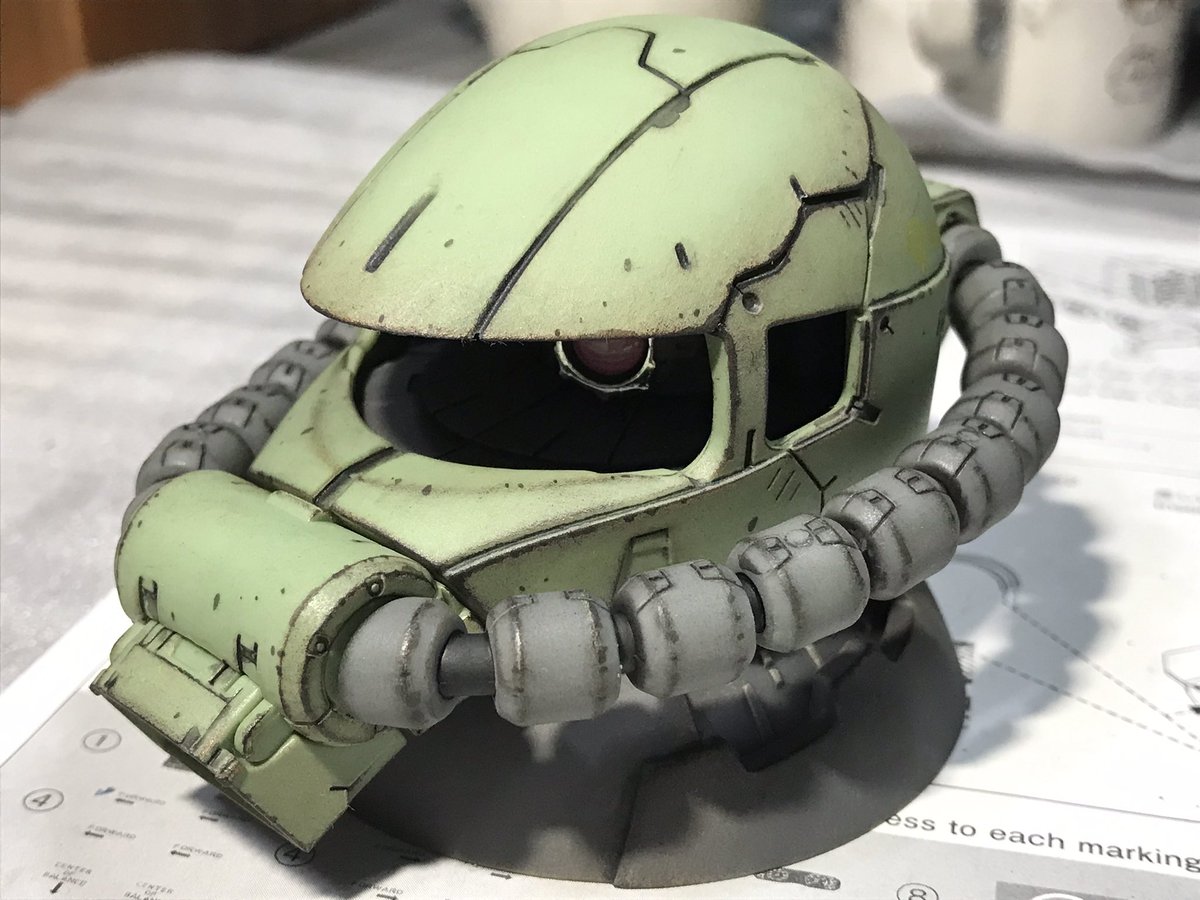 ここの所仕事が忙しくて全然ガンプラ出来てません、、、ちょっとでも気分転換に、シャアザクヘッドをサクッと汚してみました。 モノアイも加工して前に出してます この後にドアンザクとサザンクロス隊も控えてます #ザクヘッド #ガンプラの画像貼るとRTされると聞いて