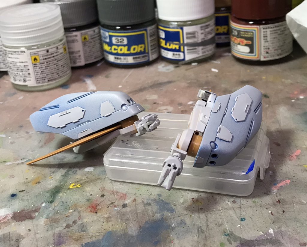 ザクレロです。 水鉄砲🔫エンジン部分周辺の基本塗装です。 エンジンとノズルの間は、メカ色になる予定です。(以前水鉄砲をカットしたのは、此処の見せ場とバランスどりの為) 二の腕の遮光の為黒を塗り、バランス確認の為仮組みしました。 #ガンプラ好きな人と繋がりたい #ザクレロ