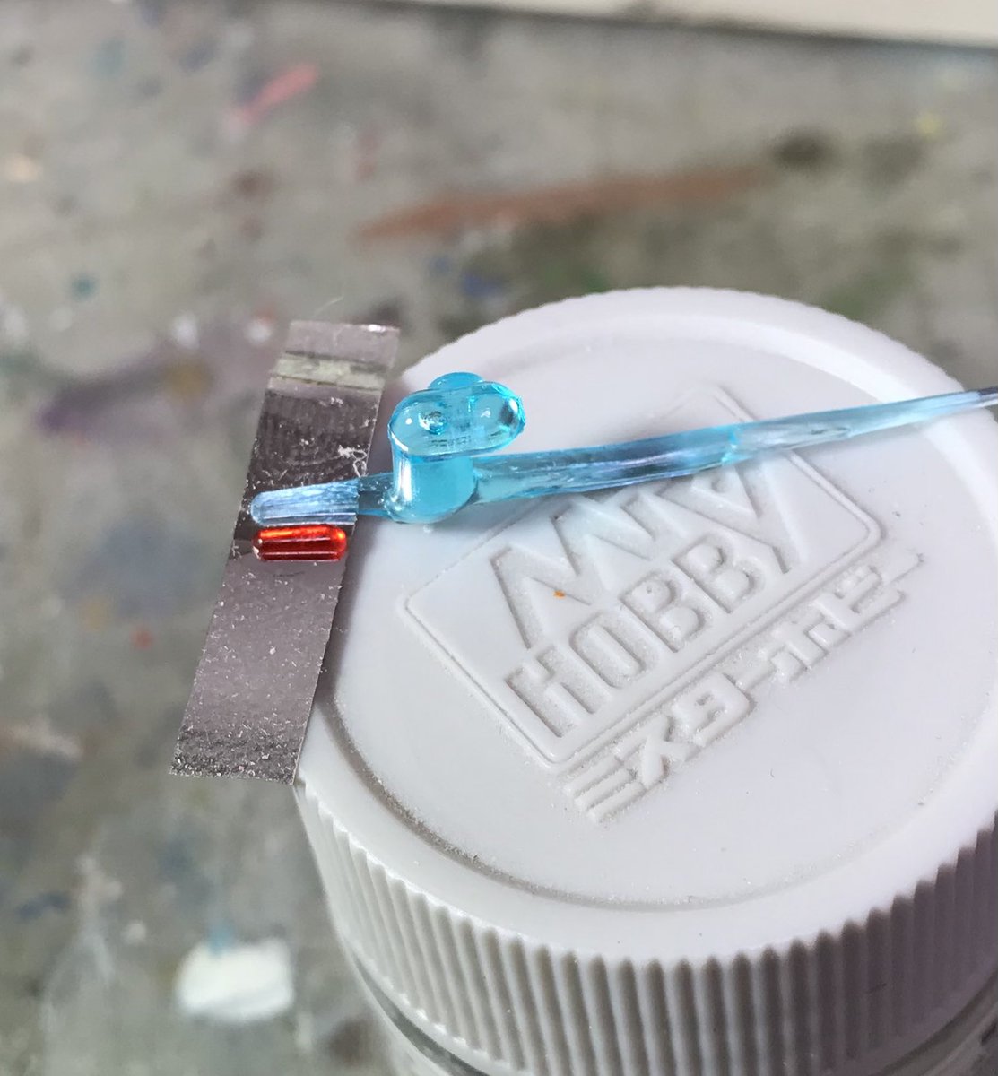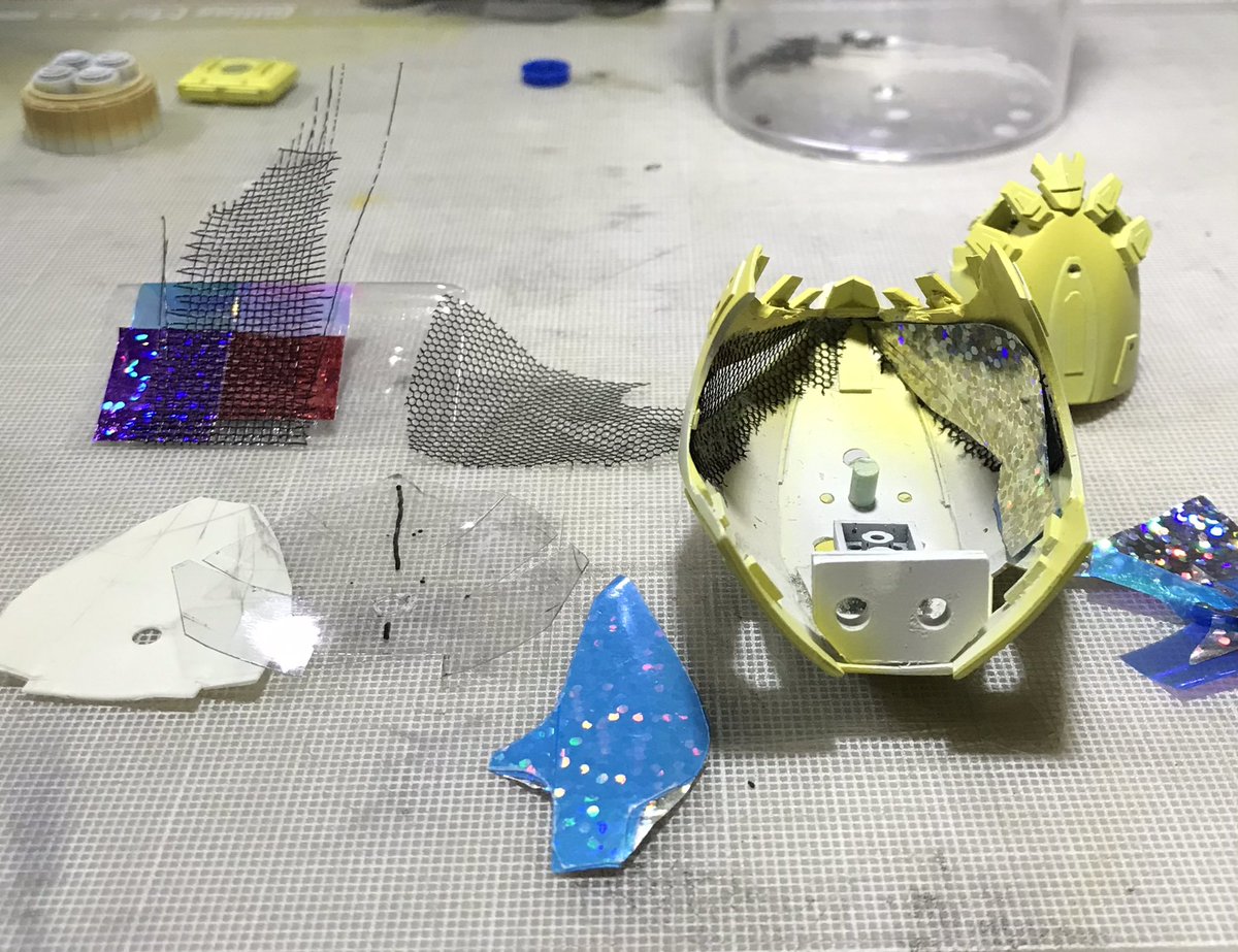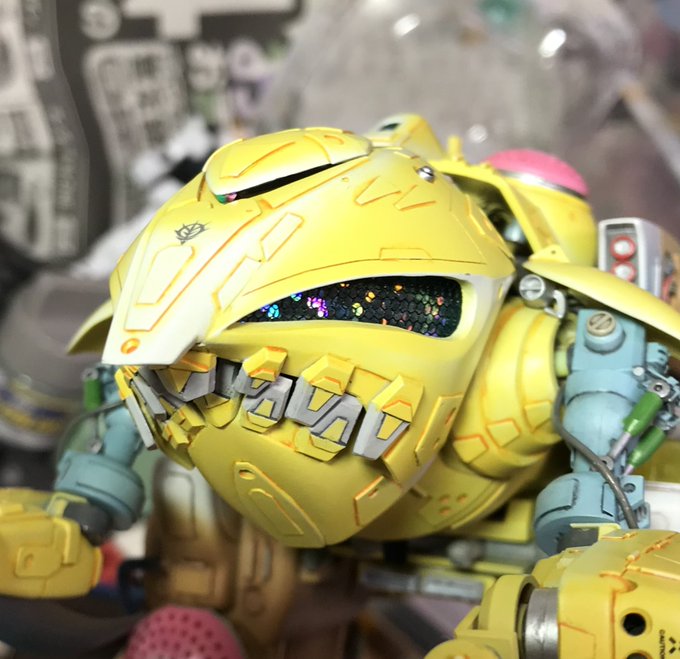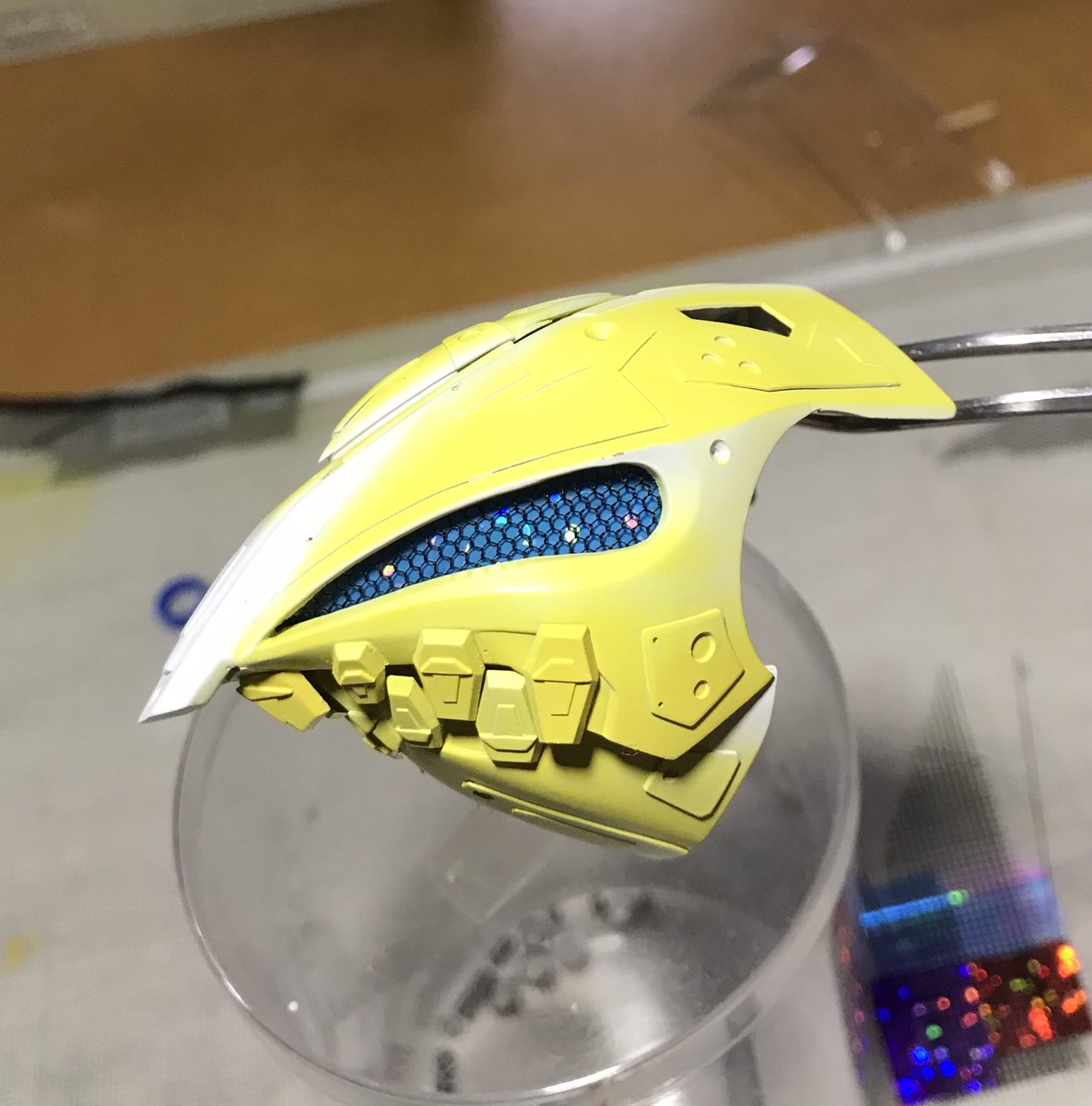 ザクレロです 試作から気になっていた目のセンサーを作りました。 ボディー側にメッシュを貼り、ホログラムシールとラメシールと透明プラ板の4重構造です。 角度によってキラキラと色味が変わります😁 #ガンプラ好きと繋がりたい #ザクレロ
