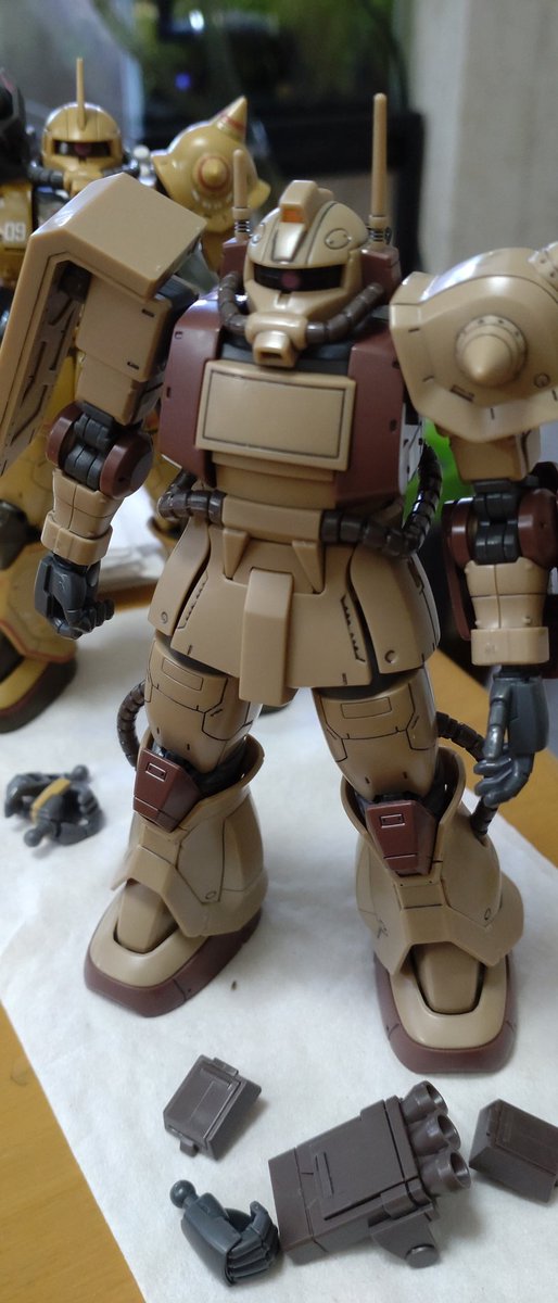 ザク・デザートタイプ完成しました! オリジンMSDのキットにリバイブザクのパーツを組み込んで、オリジン味を消し、HGUCと並べて違和感ないように作りましたデス。 ところで強制ダークモード、「投稿する」なんだか落ち着かないですね。 #ザク・デザートタイプ #HGUC #ガンプラ