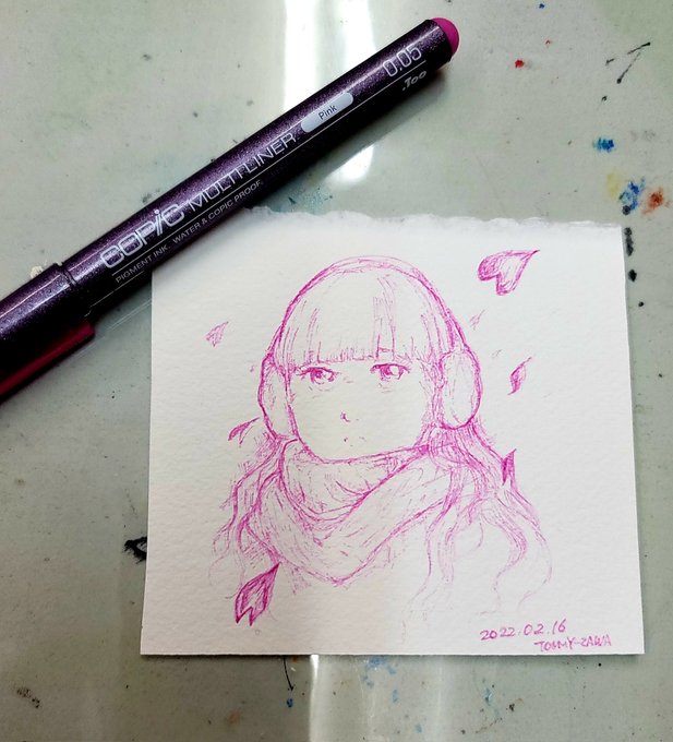 コピックマルチライナー、0.05㎜のみ。なかなかピンクもいいかも~。 #アナログイラスト #ペン画 #シェアアトリエ #drawing #pendrawing #artworks #girlillustration #drawingoftheday