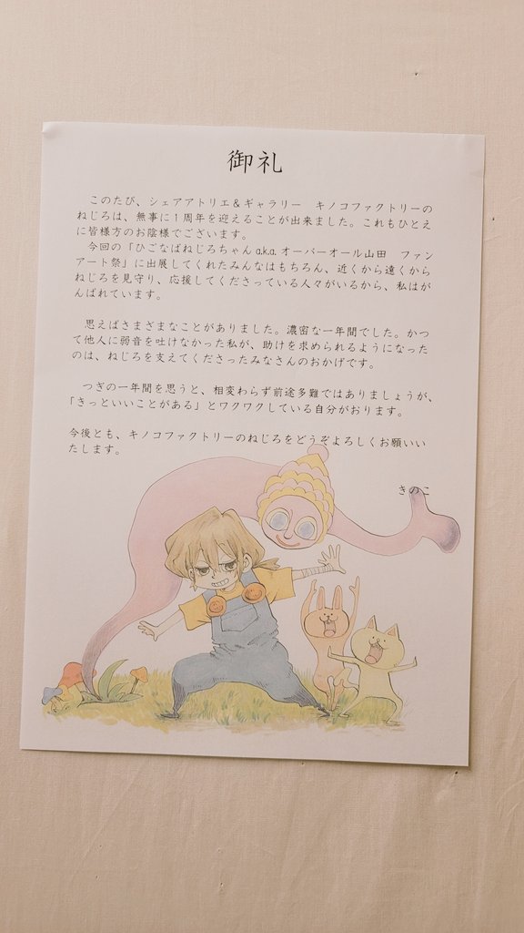 いつも楽しくて、笑い死ぬシェアアトリエが《一周年》を迎えました。ずっとみてられる、《💓》な展示です。#love は続くな。 私も作品描きました。#シェアアトリエ #イラストだからできること twitter.com/kinocononejiro…