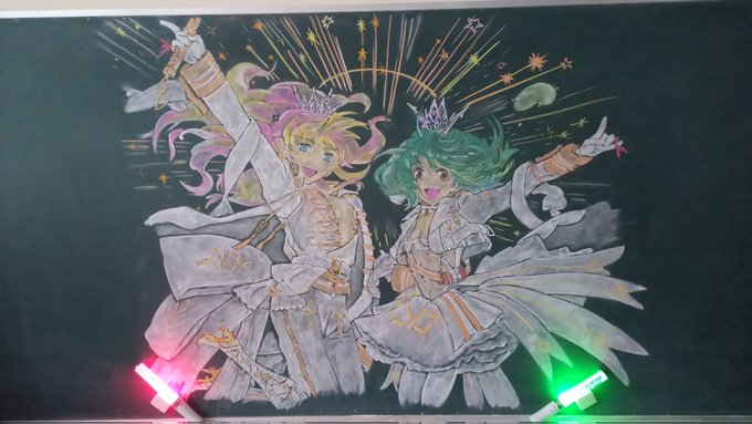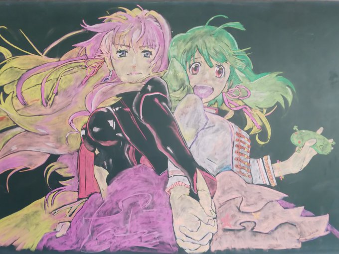 今回の黒板アートは特別版‼️ #劇場版マクロスΔ絶対LIVE!!!!!! #劇場短編マクロスF時の迷宮 の円盤発売記念で~す😍 皆さんTLでフラゲの報告羨ましい…😢 悔しいのでアップも1日フライングで😆 Δは前に描いてしまったので、今回はFのお三方です😊 #シェリル・ノーム #ランカ・リー #早乙女アルト