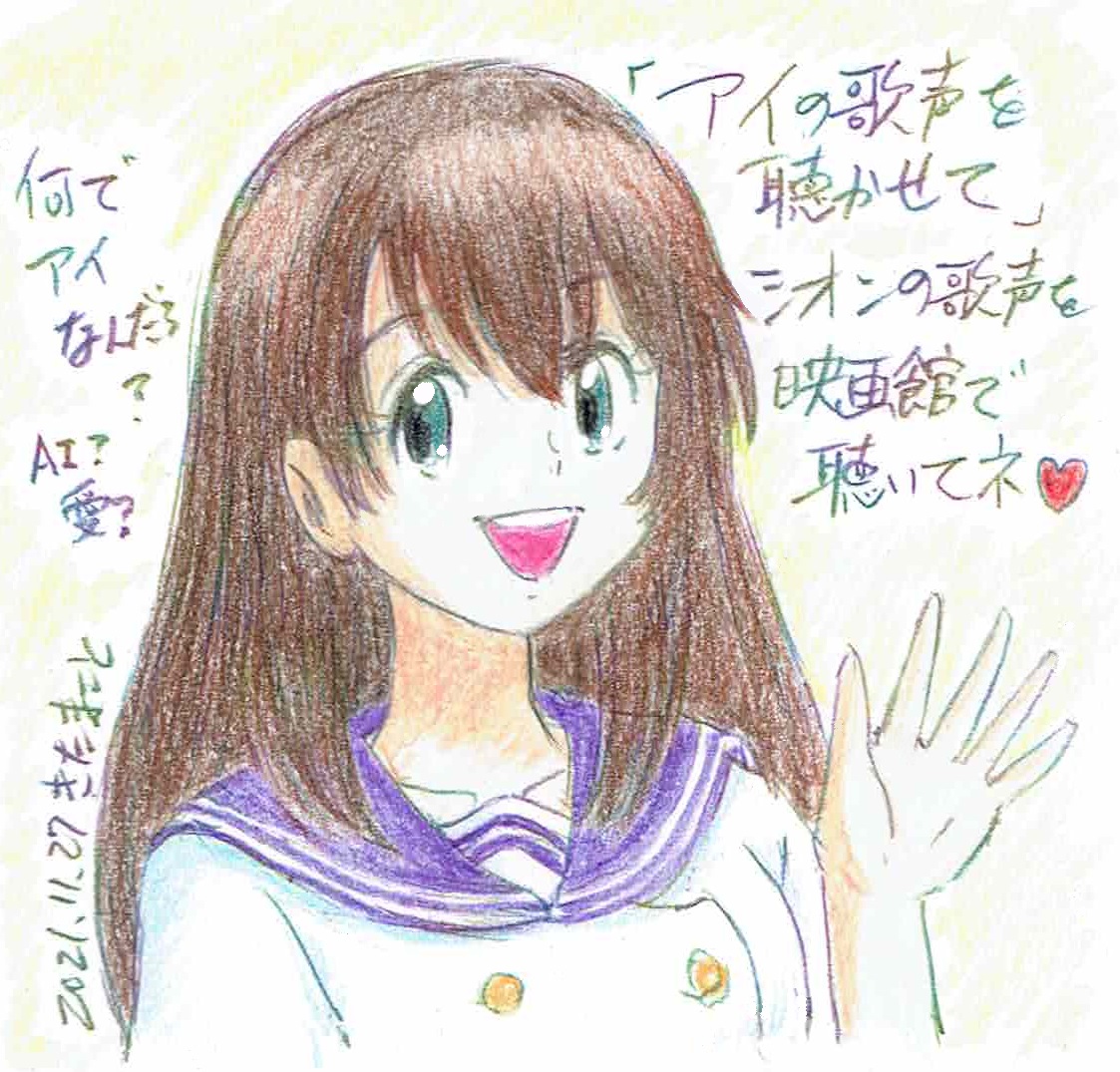 #アイの歌声を聴かせて コミケ本にも載せようと、3回目鑑賞をガマンしイラストで応援。究極超人あ~るや銀河鉄道999のパロディ絵ばかり描いてたので、作中で美人と言われた感じの #シオン ちゃん初描き。シオンの歌声を、ではなく何故アイの歌声なのかは映画館で確かめよう!w