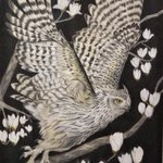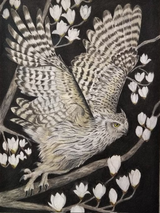 今描いてる絵の一部分。 まだまだ塗り途中だけど、予想外の雰囲気になってきてる… #イラスト #アクリル画 #リキテックス #シマフクロウ #フクロウ #illustration #drawing #acrylicpainting #blakistonsowl #owl