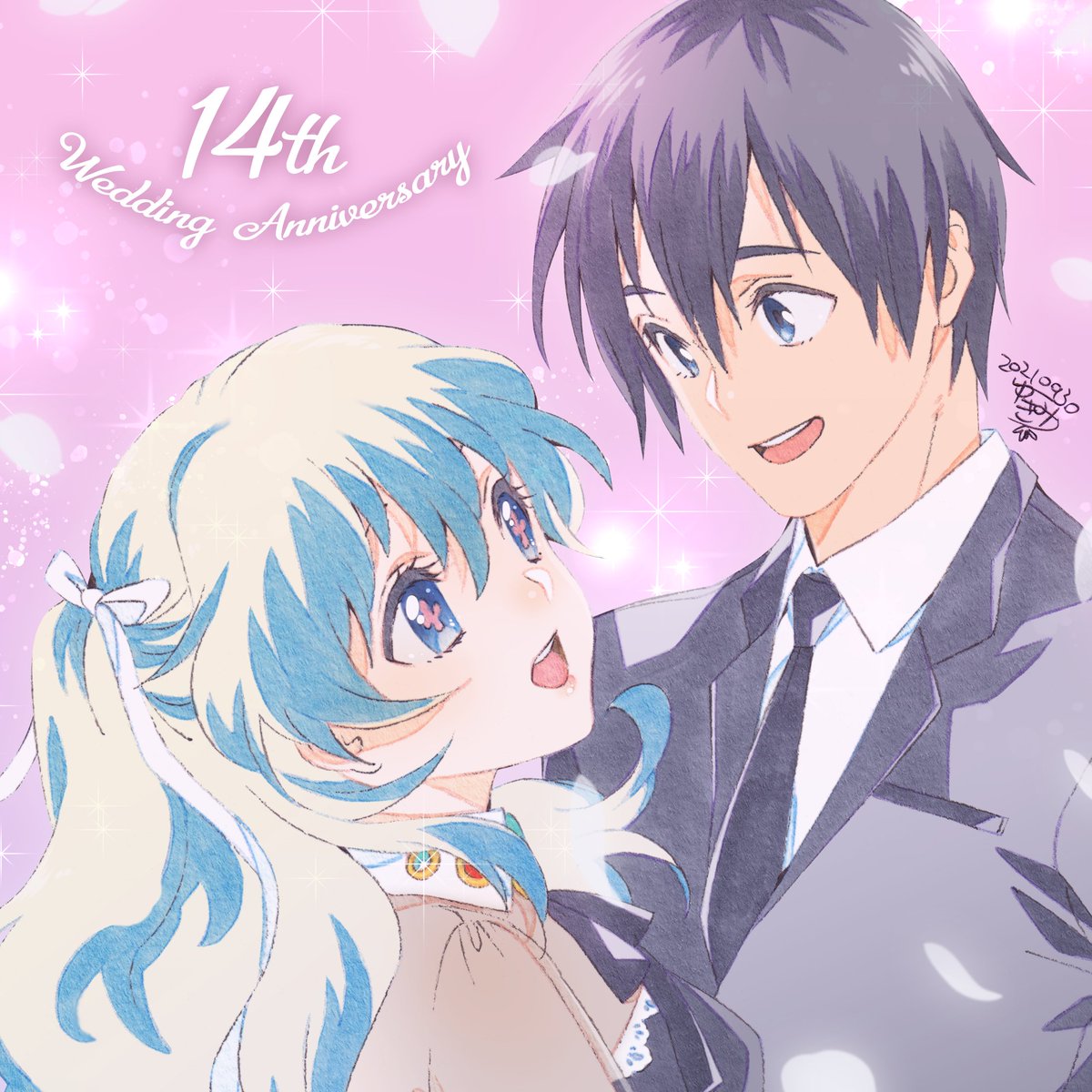 シモンさん&ニアちゃん14周年おめでとうございます🎊 今年はおめかしシモニア大人ver.で!(タイミングを逃していたのでようやく描けました……) 来年は15周年なので、色々出来たらいいなあ✨ #シモニア結婚記念日💒💕