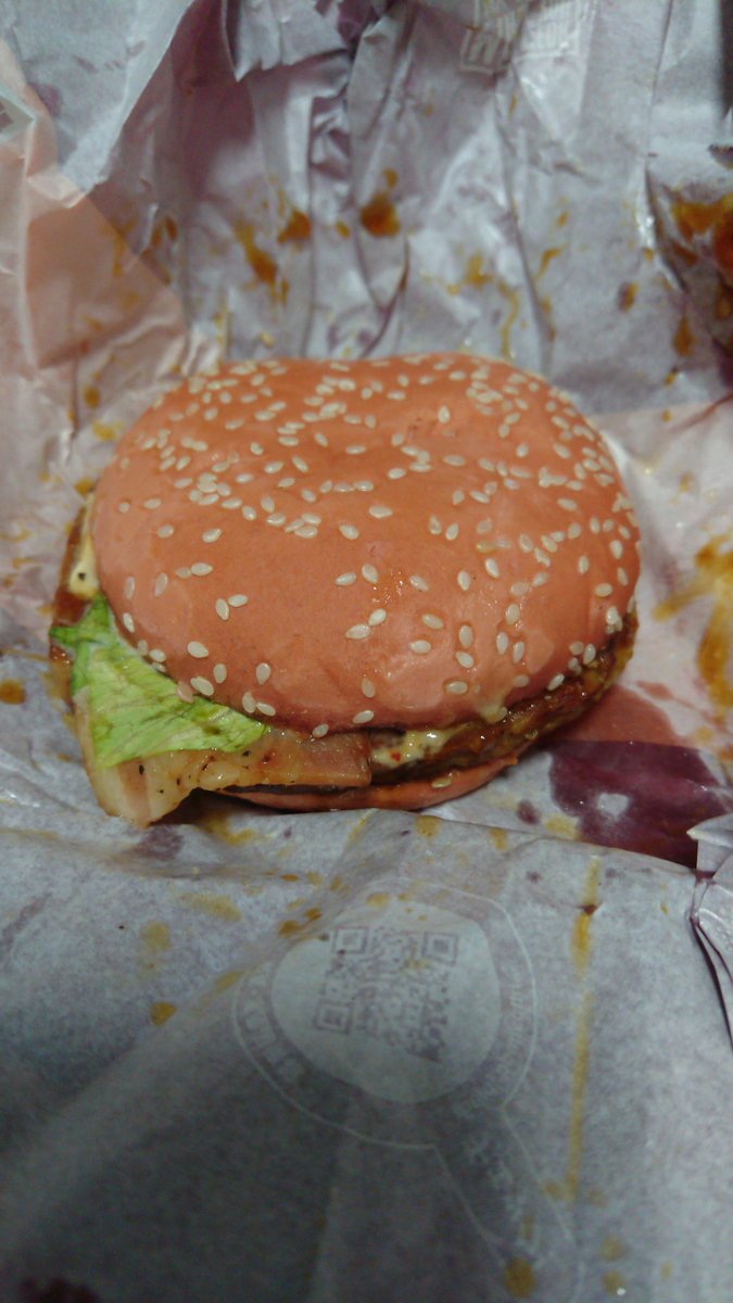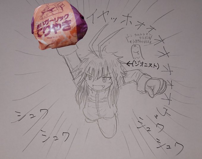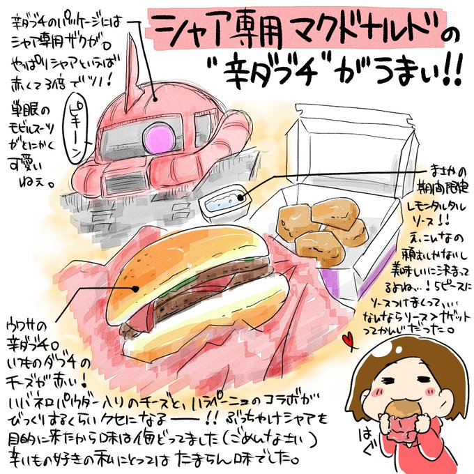 【突撃! 鬼帝軍の晩ごはん】 この頃流行りの #シャア専用マクドナルド ハンバーガーなんて昨年の冬以来食べてないけど、ジオニスト女子の余としては見逃せない。 はい、赤いガーリックてりやき。 とても美味辛でした(語彙力0) (十六夜) #落書き