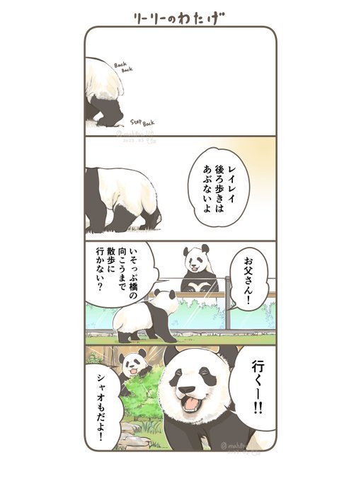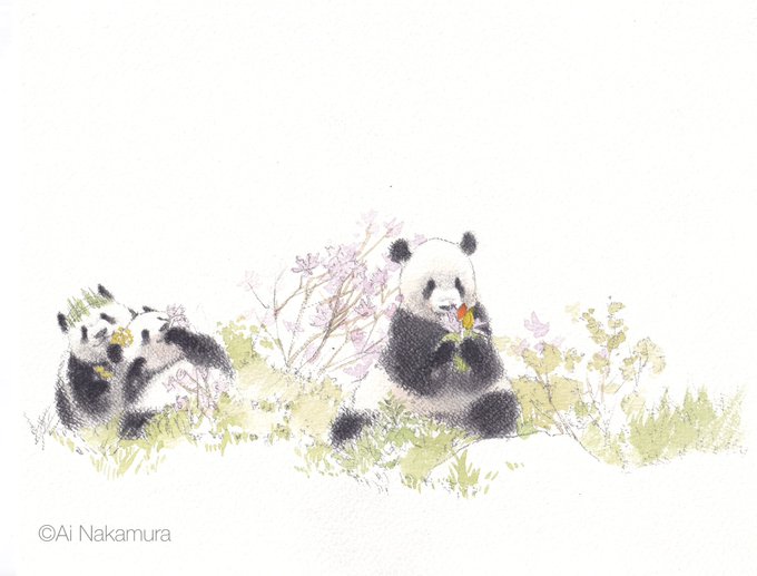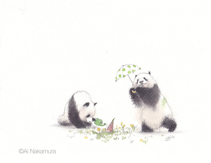 #レイレイ #シャオシャオ #illustration 上野動物園のリーリーの庭にわたげがあるかな、と4月後半に行ってみたら見当たらず👀 まだなのかなと五重塔の方まで歩いたらタンポポと共に沢山咲いていました🐼↓そんな空想漫画です。
