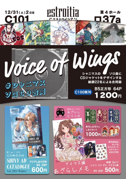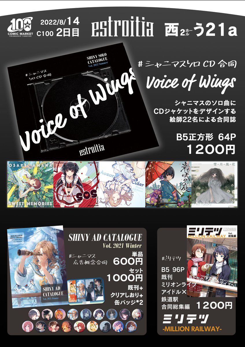 #C100 お品書き🌆 8/14 二日目 西2ホール う21a「estroitia」です! 新刊は絵師22名ご参加の #シャニマスソロCD合同 「Voice of Wings」です。 タグを押すと絵師さんのプレビューが見えます! 🍈→ melonbooks.co.jp/detail/detail.… 既刊もありますので何卒よろしくお願いします! #estroitia