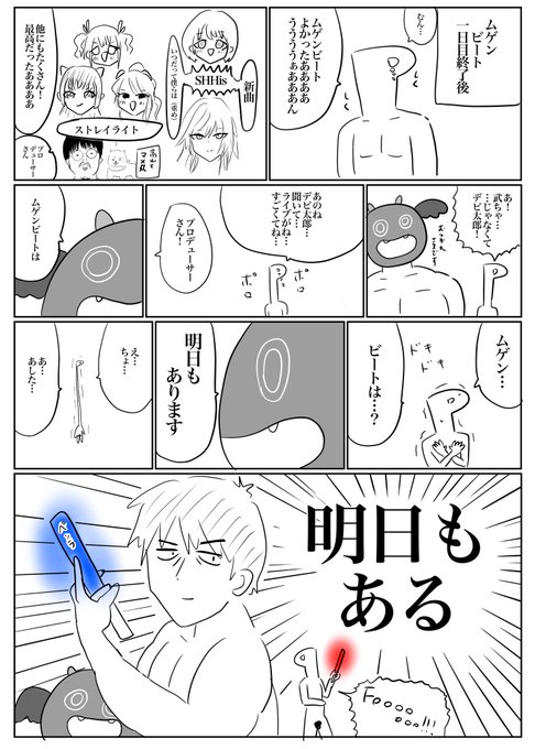 シャニマス初の対バンライブ 283PRODUCTION UNIT LIVE MUGEN BEAT一日目終了後の漫画です。セツナビートと同じ内容に見えますが、気のせいです。 #シャニマスムゲンビート_day1