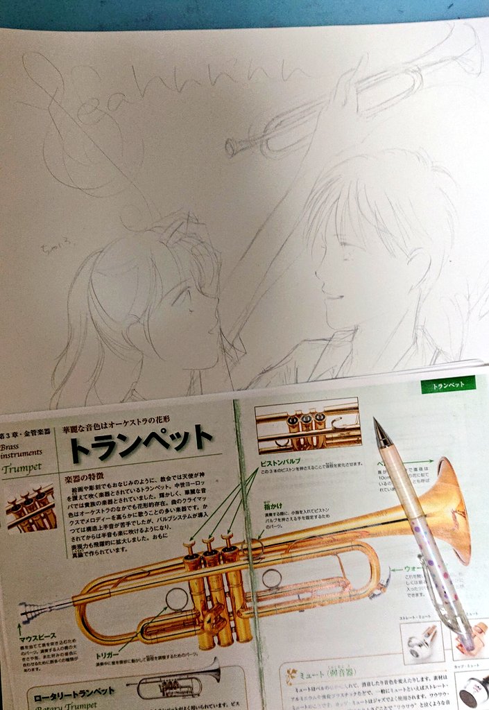 #アナログ絵を流してアナログ民を増やそう #シャープペン #下描き 🍀おはようございます🌞🌞🌞🍀 実はまた💦寝ないまま今朝を迎えてしまいまして…😣4枚目の下描きしてたらアイデア降って来たから♪ 忘れない✍️うちにこのまま続行しようかと(*´罒`*)✌️ トランペット🎺をポップに描くのは初やなぁ
