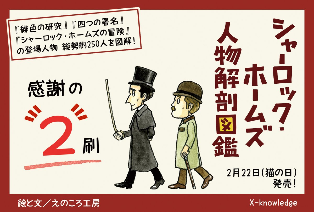本日『 #シャーロック・ホームズ人物解剖図鑑』の2刷が発売になりました。初版発売の2月2日から20日目の2月22日に2刷と2尽くし。ホームズとワトスンのふたりを表しているようで本当に嬉しいです(*^^*)♪本当に皆さまのおかげです!ありがとうございます(*><*)m(__)m! xknowledge.co.jp/book/978476783…