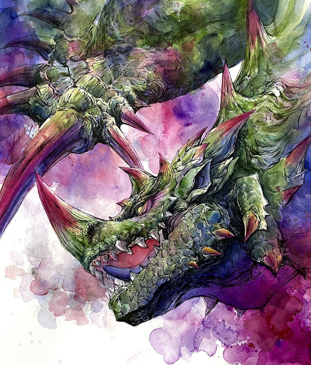 ムフェト様🫶🏻💕︎︎ 皆で回したのが懐かしい…🥺 この王道ドラゴンな見た目が最高にわたしのタイプ。 ✨ #これでフォロワーさん増えました ✨ #モンハン #WHW #イラスト #水彩画 #シュミンケ #透明水彩 #MHWアイスボーン