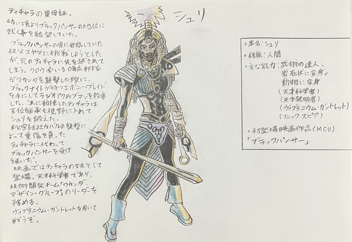 手描きMCUヒーロー列伝シュリ ・本名:シュリ ・種族:人間 ・能力:武術の達人、岩石状に変身、動物に変身(天才科学者、天才発明家) ・初登場映画作品(MCU) 『ブラックパンサー』 #marvel #illust #芸術同盟 #絵描きさんと繋がりたい #みんなで楽しむTwitter展覧会 #WakandaForever #シュリ #Shuri