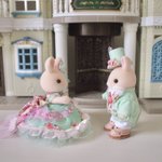 『春の訪れ』 春のイメージで、ドレス&タキシード 作ってみました。 つまみ細工で咲き始めた花を表現。 グリーンとピンクで優しい色合いに仕上げてみました。 明るい春のイメージ、伝わったら嬉しいです🌸 #シルバニアハンドメイドコンテスト #minne #お洋服部門 #トーカイ #シルバニアファミリー