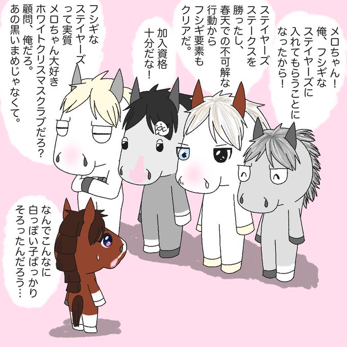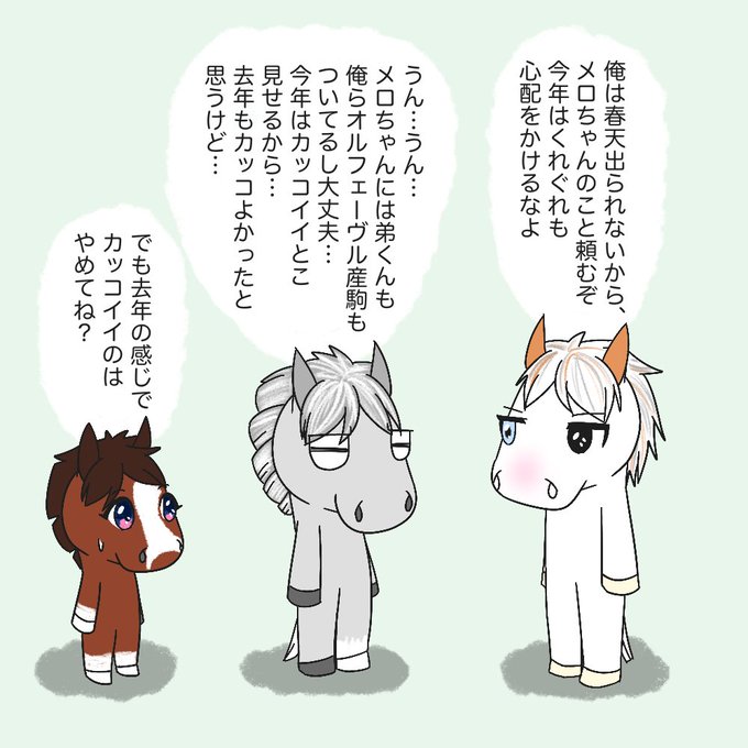今日のメロちゃん 375 #シロニイ くんと #シルヴァーソニック くんが出会って… ステイヤーズやサウジのときのカッコイイにしてください。 twitter.com/sansporace/sta… #メロディーレーン