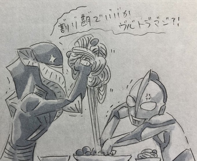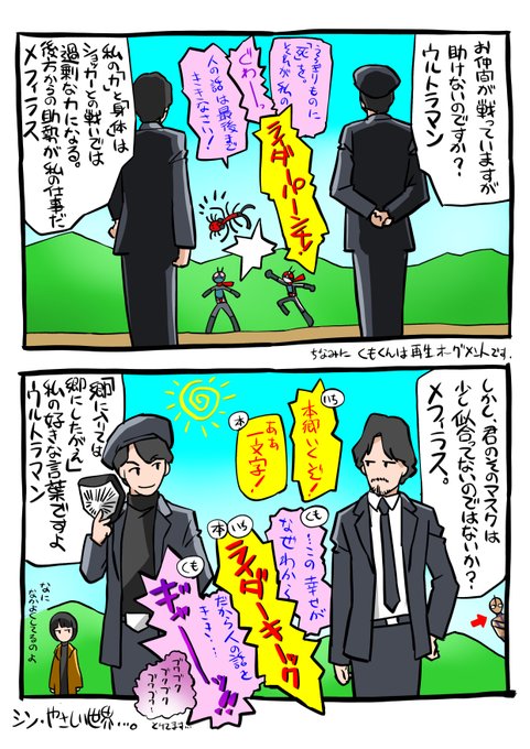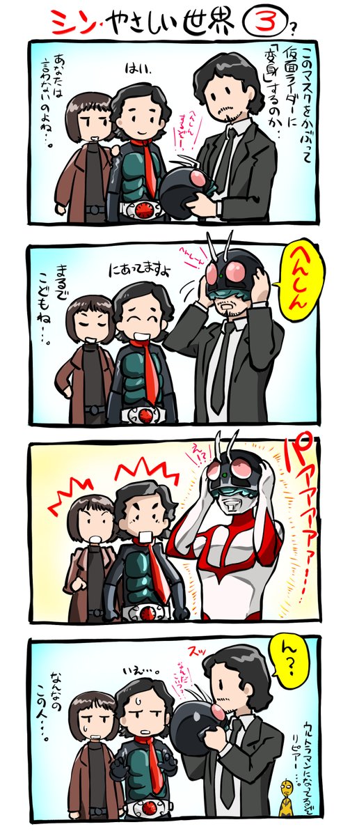頭空っぽラクガキ424 「シン・仮面ライダー 」から「シン・やさしい世界 」 先日描いたシン・ライダー世界にウルトラマンが来たら、の妄想が自分の脳内でけっこう膨らんだので、珍しくマンガっぽいラクガキにしてみた。 こんな世界も良いよね? #シン・仮面ライダー #シンウルトラマン