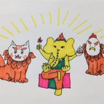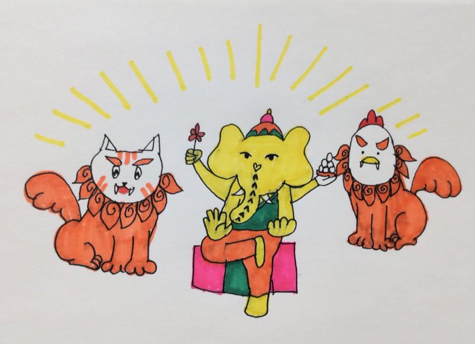 おはようございます!! #シーサーの日 みんなでシーサーに、って、🐘だけ、 ガネーシャになってる!!😳 今日も素敵な日曜日を〜😉 #イラスト好きな人と繋がりたい #絵描きさんと繫がりたい #みんなで楽しむTwitter展覧会 #イラスト
